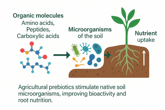 Agricultural prebiotics stimulate native soil microorganisms, improving bioactivity and root nutrition.