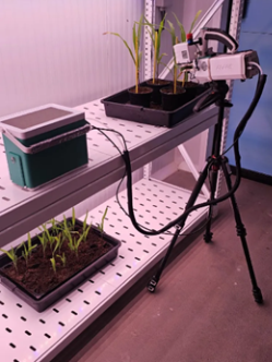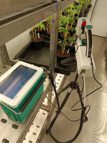 Plants are grown in growth chambers under regulated and adjustable environmental conditions. Physiological measurements are performed directly on the plant following standardized protocols.